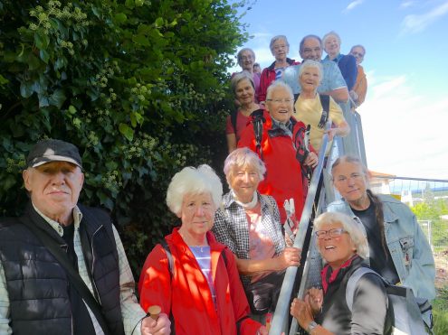 Einige Senioren stärkten sich mit Zwetschgen und Walnüssen vom Fallobst und genossen den herrlichen Ausblick auf den Jusi, den Hohen Neuffen, die Teck sowie die Schwäbische Alb. Über Stahlgittertreppen kamen die Senioren in den Pfarrgarten und zur Michaelskirche. Eine kurze Verschnaufpause wurde gemacht und dabei die gegenüberliegende mächtige historische Zehntscheuer bewundert.