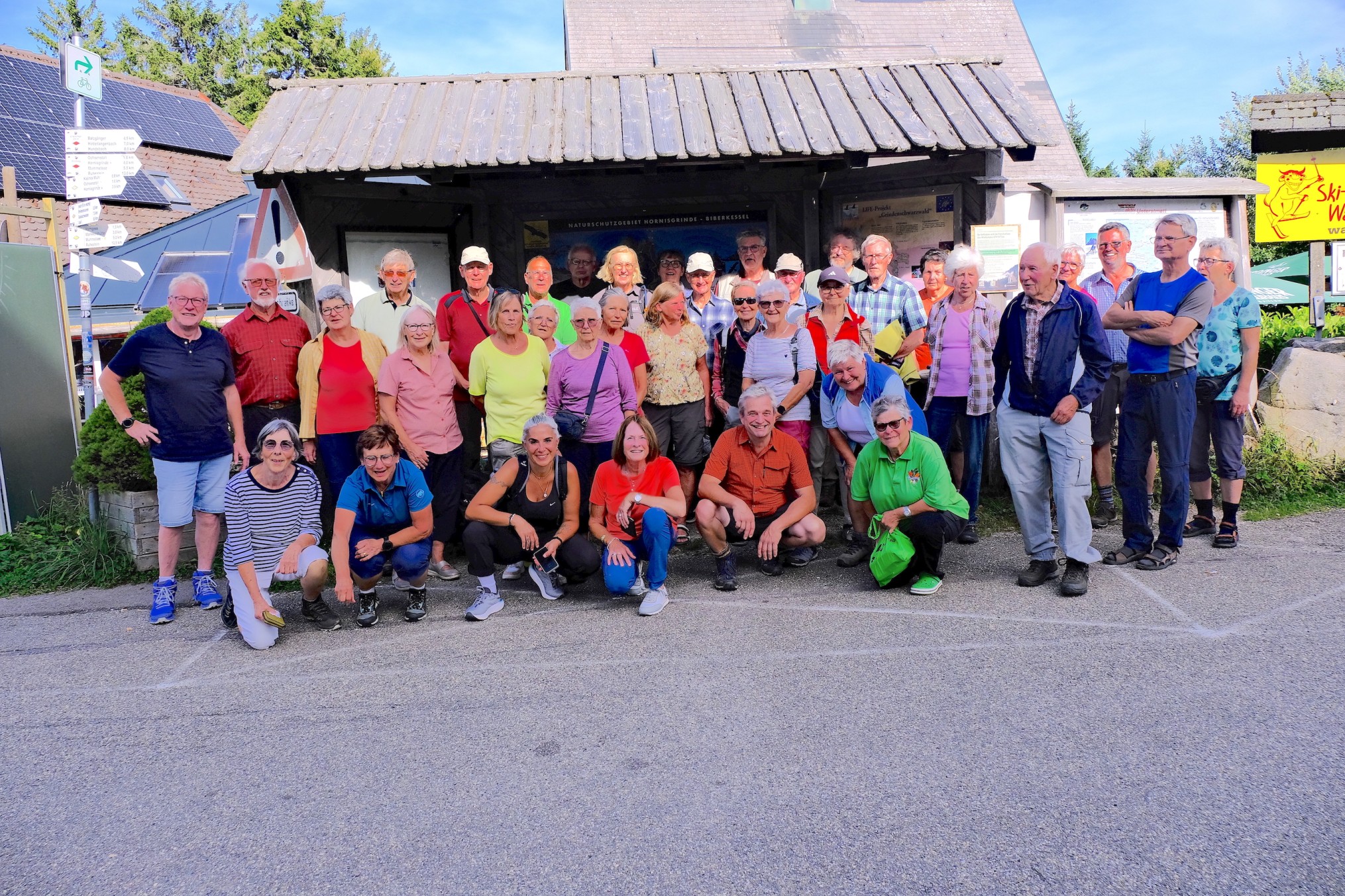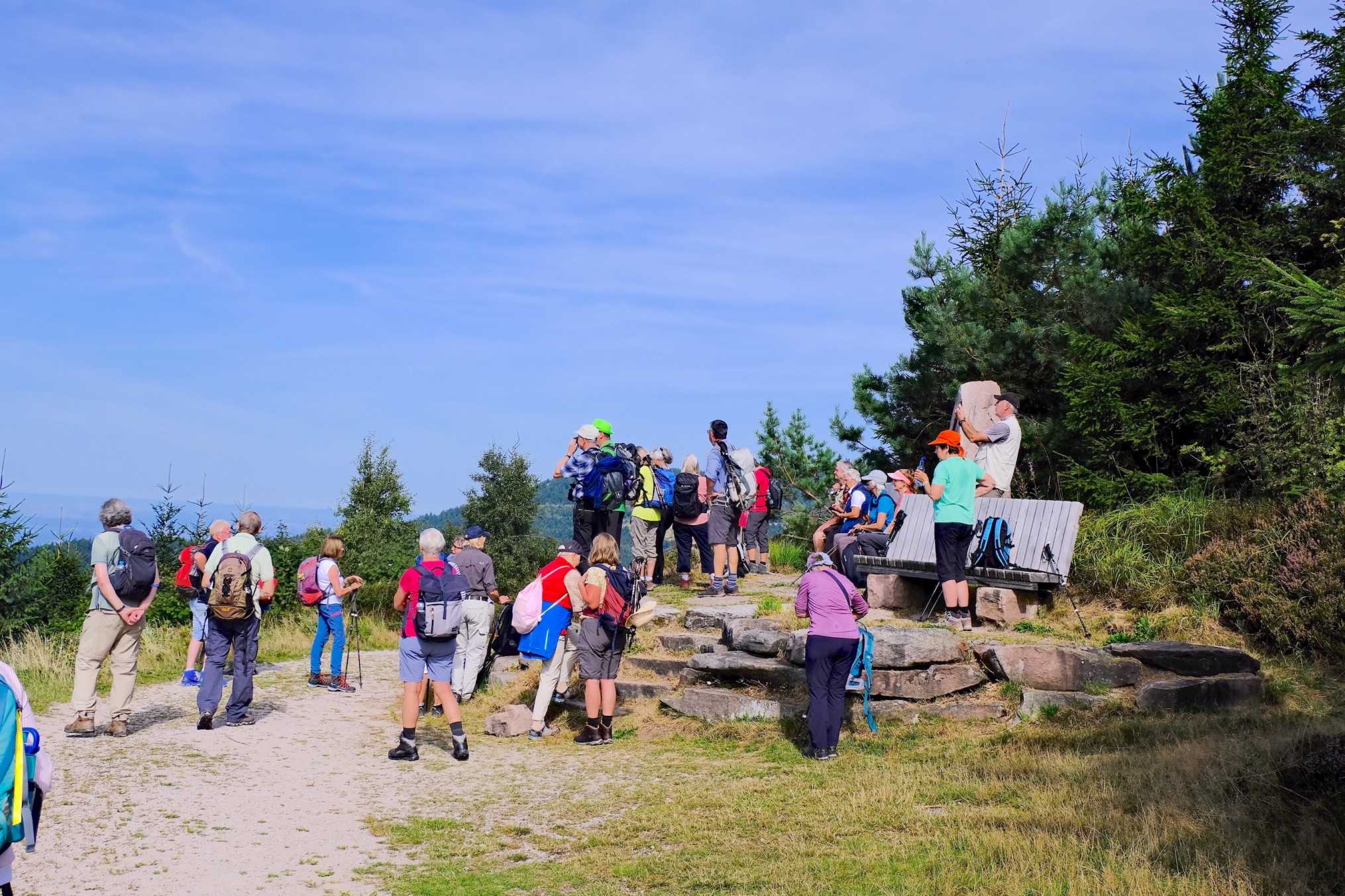 Mit strahlendem Sonnenschein und wohligen Temperaturen wurde die 42-köpfige Wandergruppe am Sonntag, 07. September vom Nordschwarzwald empfangen. Über die Schwarzwaldhochstrasse, Deutschlands ältester und bekannteste Panoramastrasse, wurde der Ruhestein auf der Passhöhe von 912m erreicht, benannt nach einem 2m³ großen Sandsteinfindling der den Reisenden zur Rast diente. Über der Passgrenze querend verlief einst die Grenze zwischen Großherzogtum Baden und Königreich Württemberg. Gemütlich gings bergauf in den Bannwald Wilder See der bereits vor über 100 Jahren entstand. Auf dem Weg zum Eutinggrab gabs kurze Blicke auf den 120m tiefer gelegenen Wildsee. Eine Gedenktafel macht auf Julius Euting 1839-1913 aufmerksam. Er war Orientforscher und großer Förderer des Schwarzwaldvereins. Seinem Wunsch gemäß wurde seine Urne auf dem Seekopf beigesetzt. Durch Hochmoor und Weidelandschaft gings weiter an der Darmstädter Hütte vorbei zum Seibelseckle. Schöne Ausblicke ins Achertal, die Rheinebene bis zu den Vogesen säumten den Weg. Nach kurzer Rast ging es weiter zum Mummelsee. Traumhaft gelegen ist er der größte Karsee des Schwarzwalds. Laut einer Sage geht der Name des Sees zurück auf Seerosen, im Volksmund Mummeln genannt. Steinig und felsig führte der Weg hinauf auf die 1164m hoch gelegenen Hornisgrinde. Der fantastische Ausblick entschädigte die Strapazen. Hier war noch bis 1999 militärisches Sperrgebiet. Ein einziger Bunker ist noch erhalten geblieben. Durch geschütztes Hochmoor mit seiner einzigartigen Flora und Fauna erreichten die Wanderer den Bismarckturm. Der anschließende Abstieg nach Unterstmatt erforderte nochmals die volle Aufmerksamkeit.
