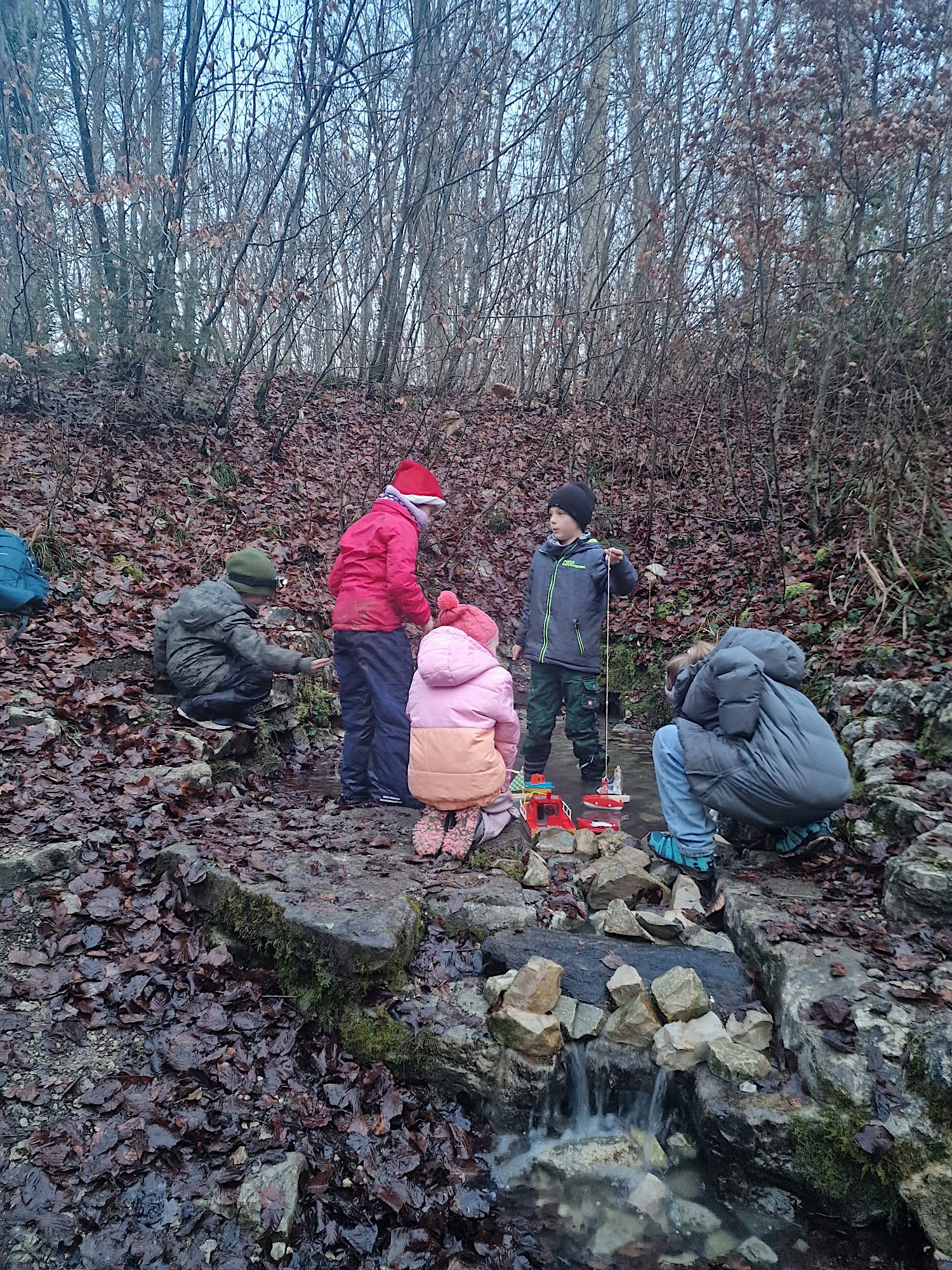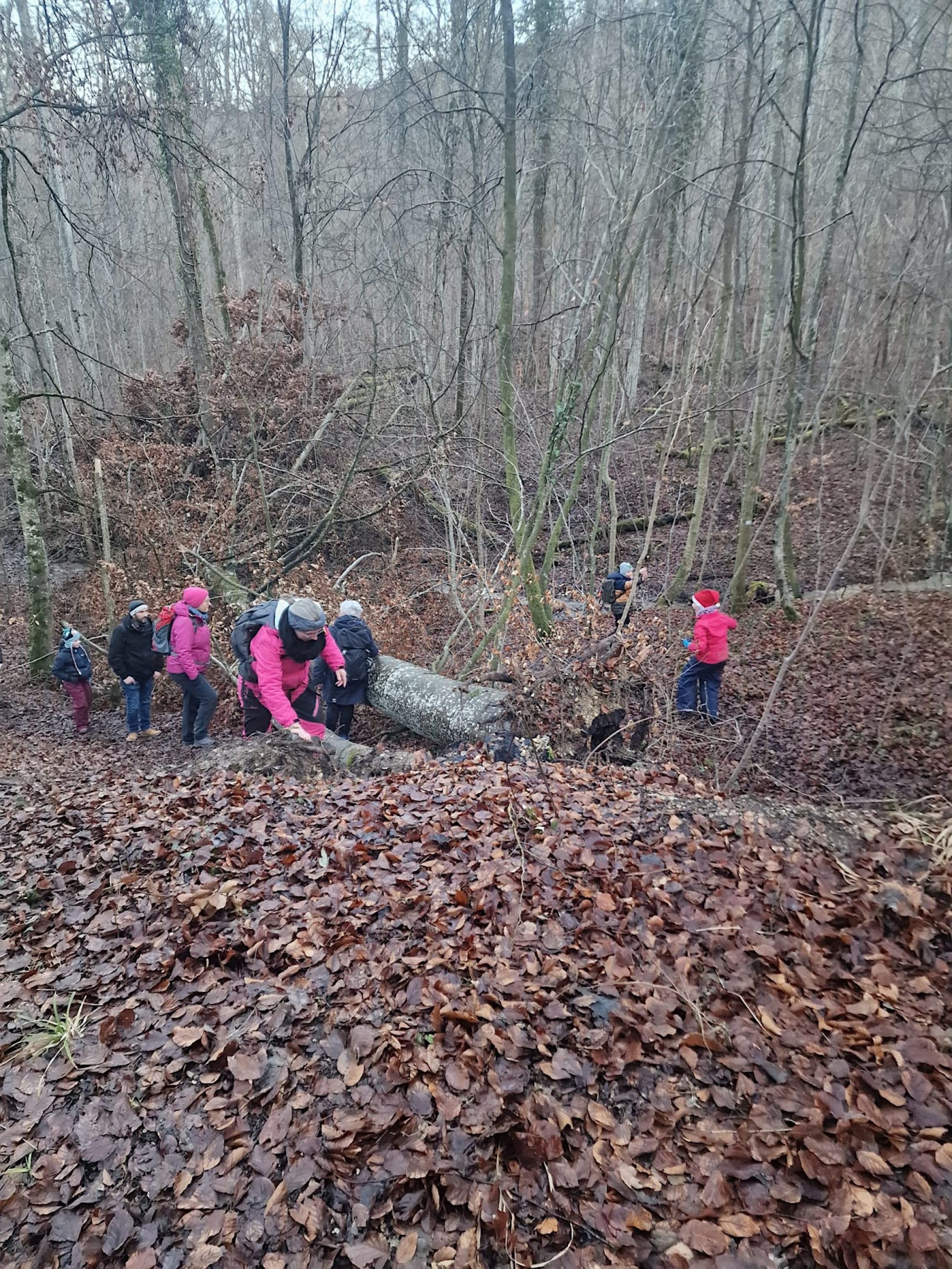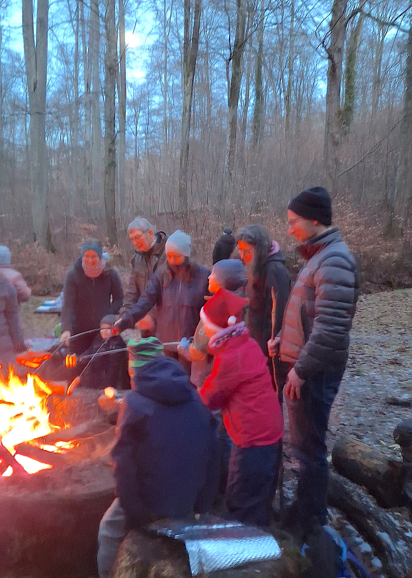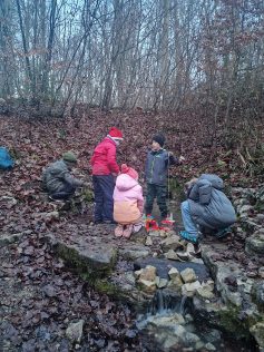 Die Familiengruppe des Albvereins Pfullingen traf sich am 31. Jan. zur Nachtwanderung. 14 Kinder und genauso viele Erwachsene wanderten vom Parkplatz Selchental zur Breitenbachquelle. Es ging direkt am Bach entlang, über Stock und Stein, ein dicker Baumstamm, der umgestürzt war, musste überwunden werden. An der Quelle angekommen machten die Erwachsenen erst mal Feuer, die Kinder ließen derweil kleine Boote im Bach schwimmen.